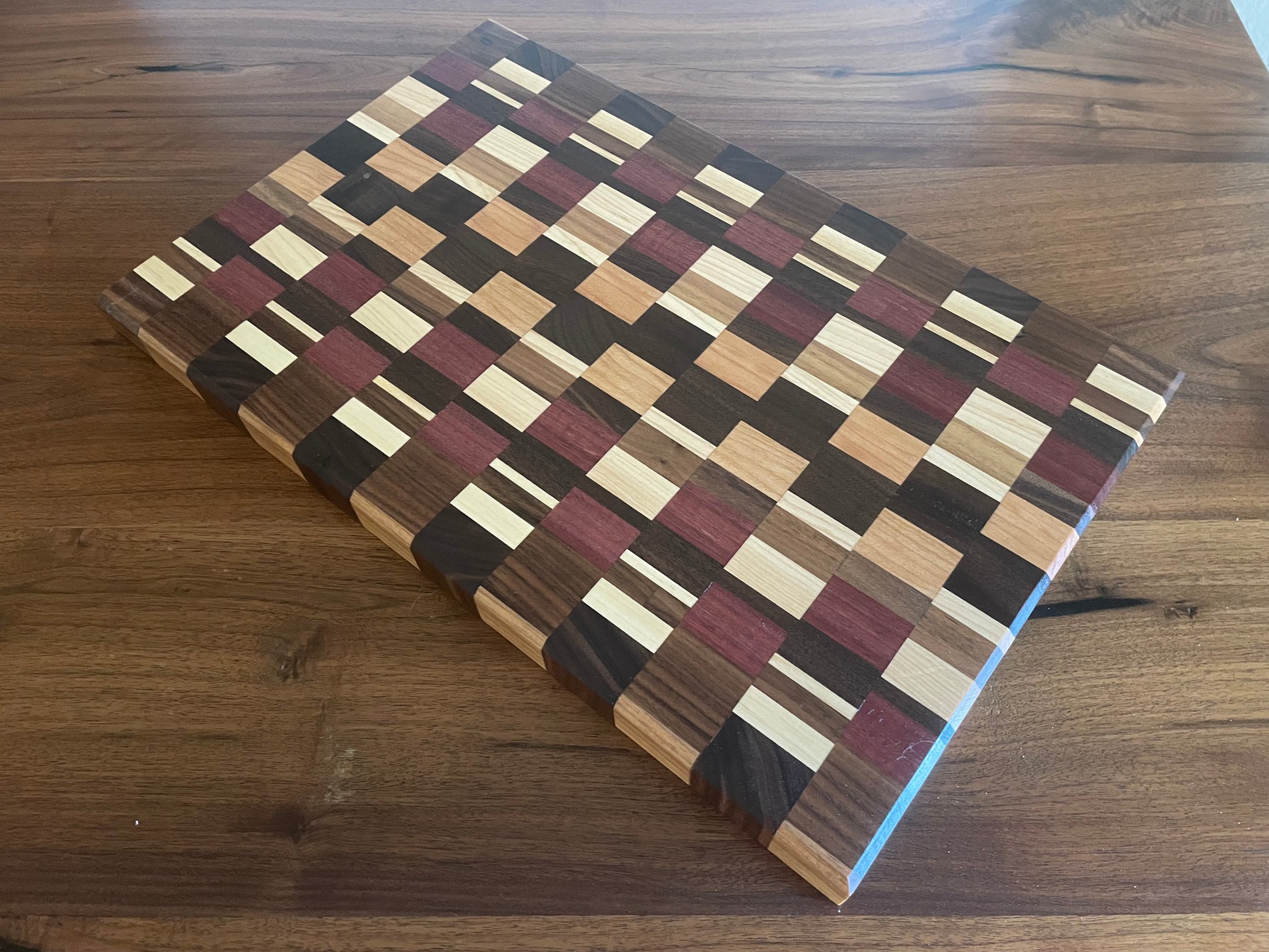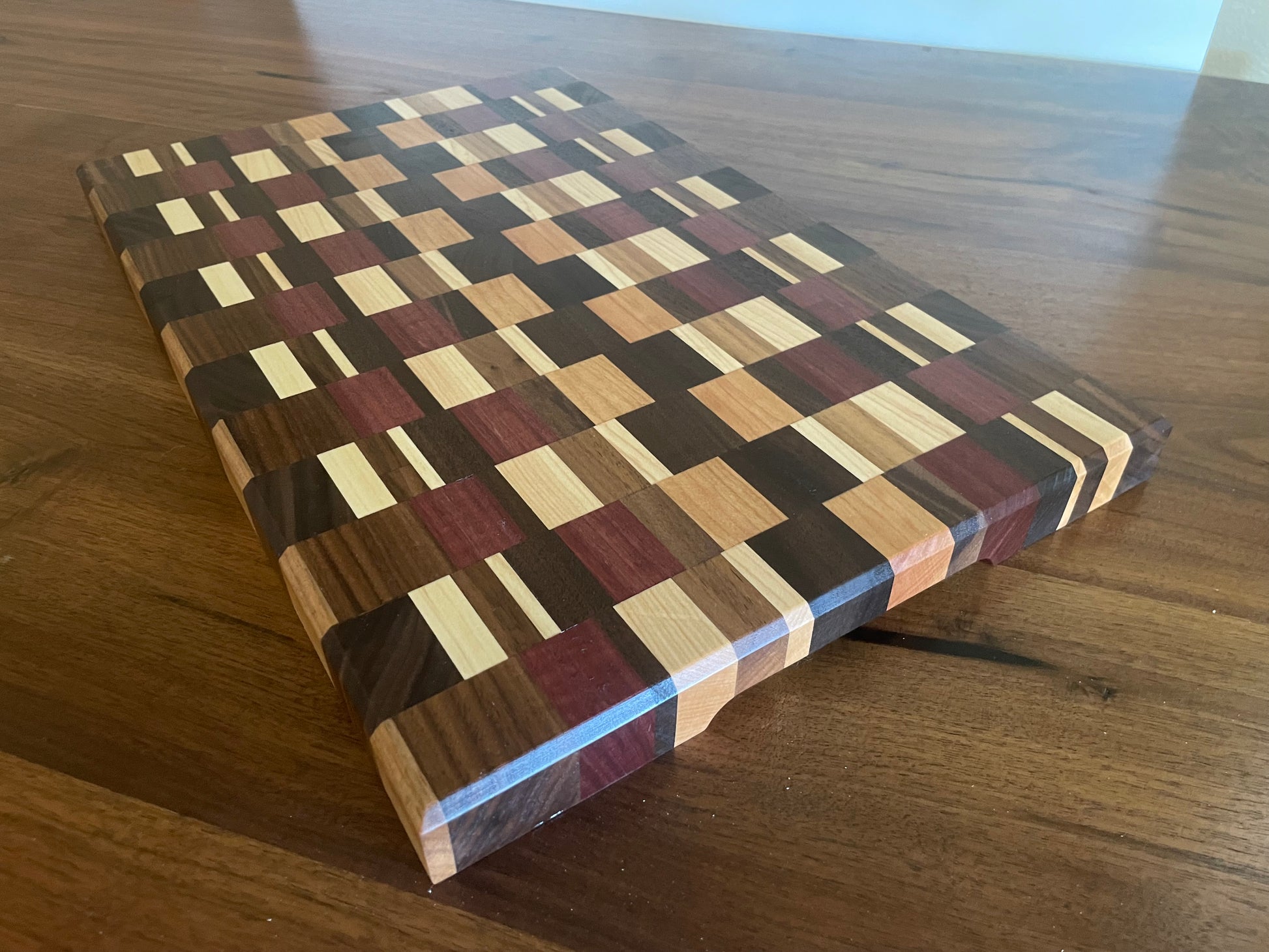 Made from Black Walnut, Maple, Purple Heart, and Cherry edge grain cutting board.