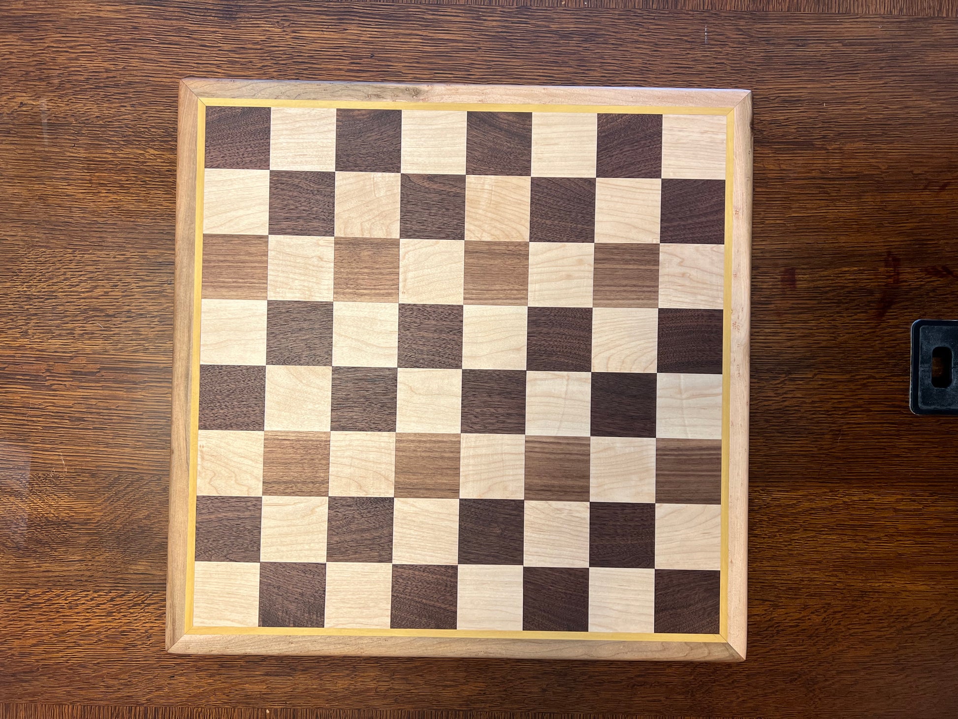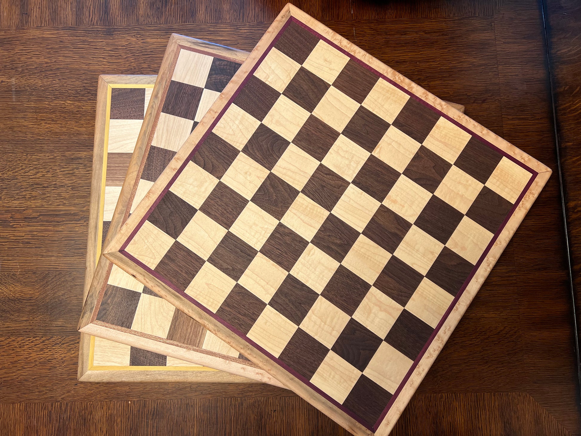 Experience the timeless elegance of tournament-ready craftsmanship with our handcrafted chessboards. Each board is built from rich black walnut and creamy maple, framed with a striking Purple Heart accent border and finished with a birdseye maple edge that adds depth and distinction. The 2¼-inch squares follow official tournament regulations, offering the perfect balance of beauty and playability.