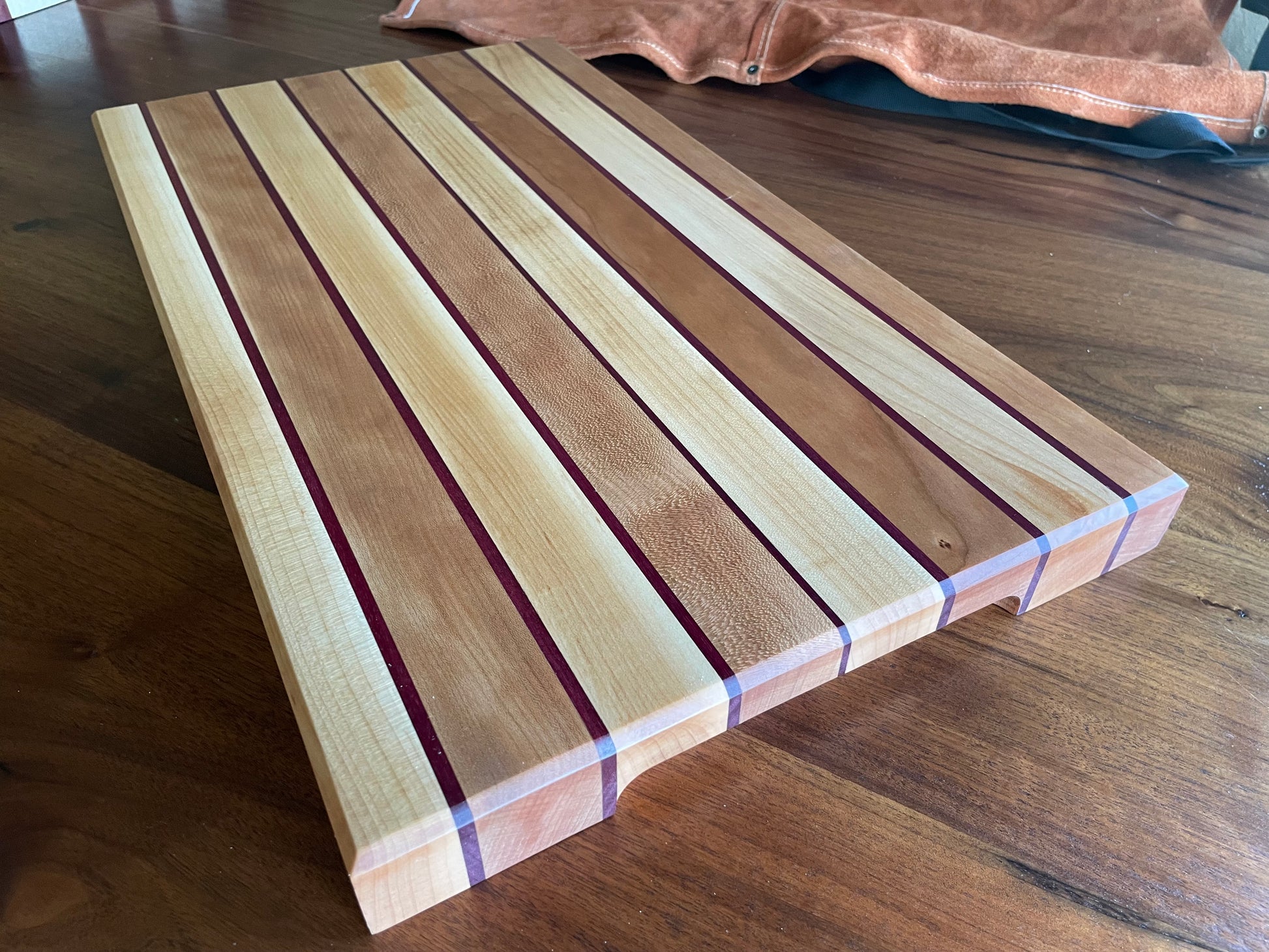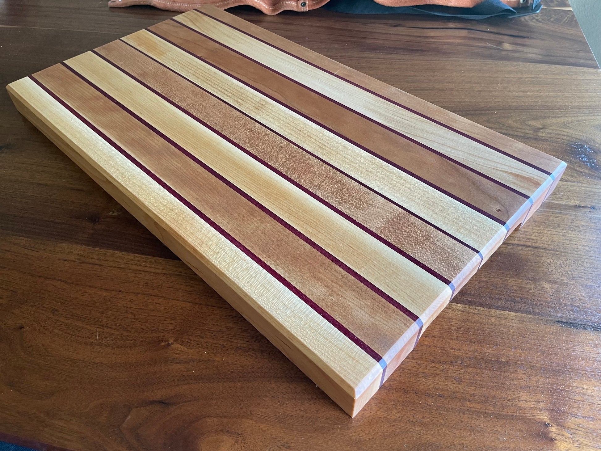 Made from Maple, Cherry, and Purple Heart edge grain Cutting Board.